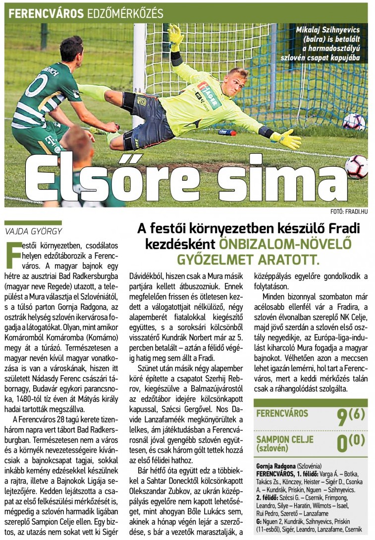 A Bajnokok Ligája-selejtezőre készülő Ferencváros az első nyári felkészülési mérkőzésén a szlovén harmadosztályú bajnokság Északi csoportjában a legutóbbi idényt a 6. helyen záró Sampion Celjével találkozott Regedén (Gornja Radgonában).
