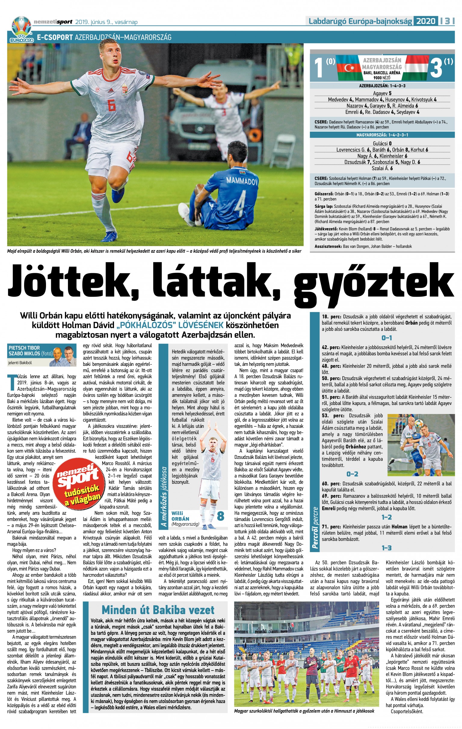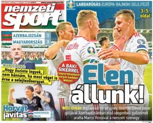 A magyar labdarúgó-válogatott 3–1-re legyőzte idegenben Azerbajdzsánt a 2020-as Európa-bajnokság selejtezőjének harmadik fordulójában. Marco Rossi csapata az első félidőben Willi Orbán góljával került előnybe, majd a fordulás után növelni tudta azt a hazaiak szépítő találata ellenére is.