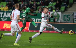 Szécsi jobb oldali beadására már emeli a lábát a kapu torkában Garba, de szereli őt a bevetődő Frimpong!