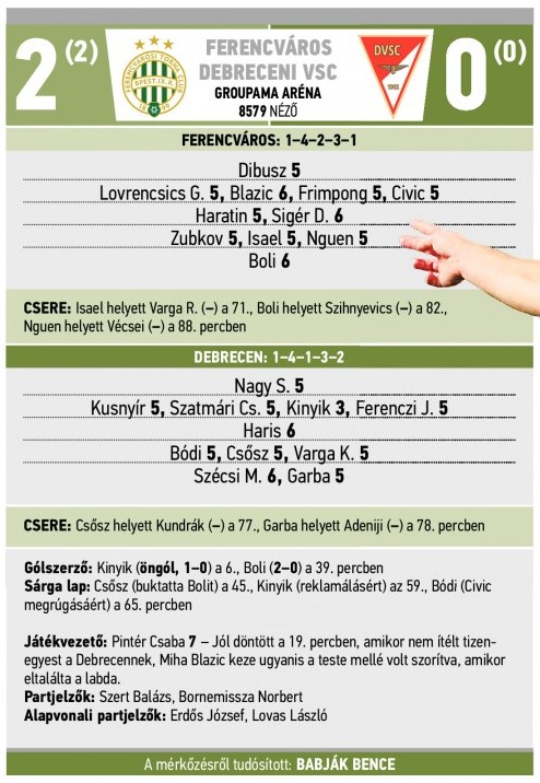 Ferencváros: Dibusz — Lovrencsics G., Blazic, Frimpong, Civic — Haratin, Sigér — Zubkov, Isael (Varga R., 72.), Nguen (Vécsei, 88.) — Boli (Szihnyevics, 83.)