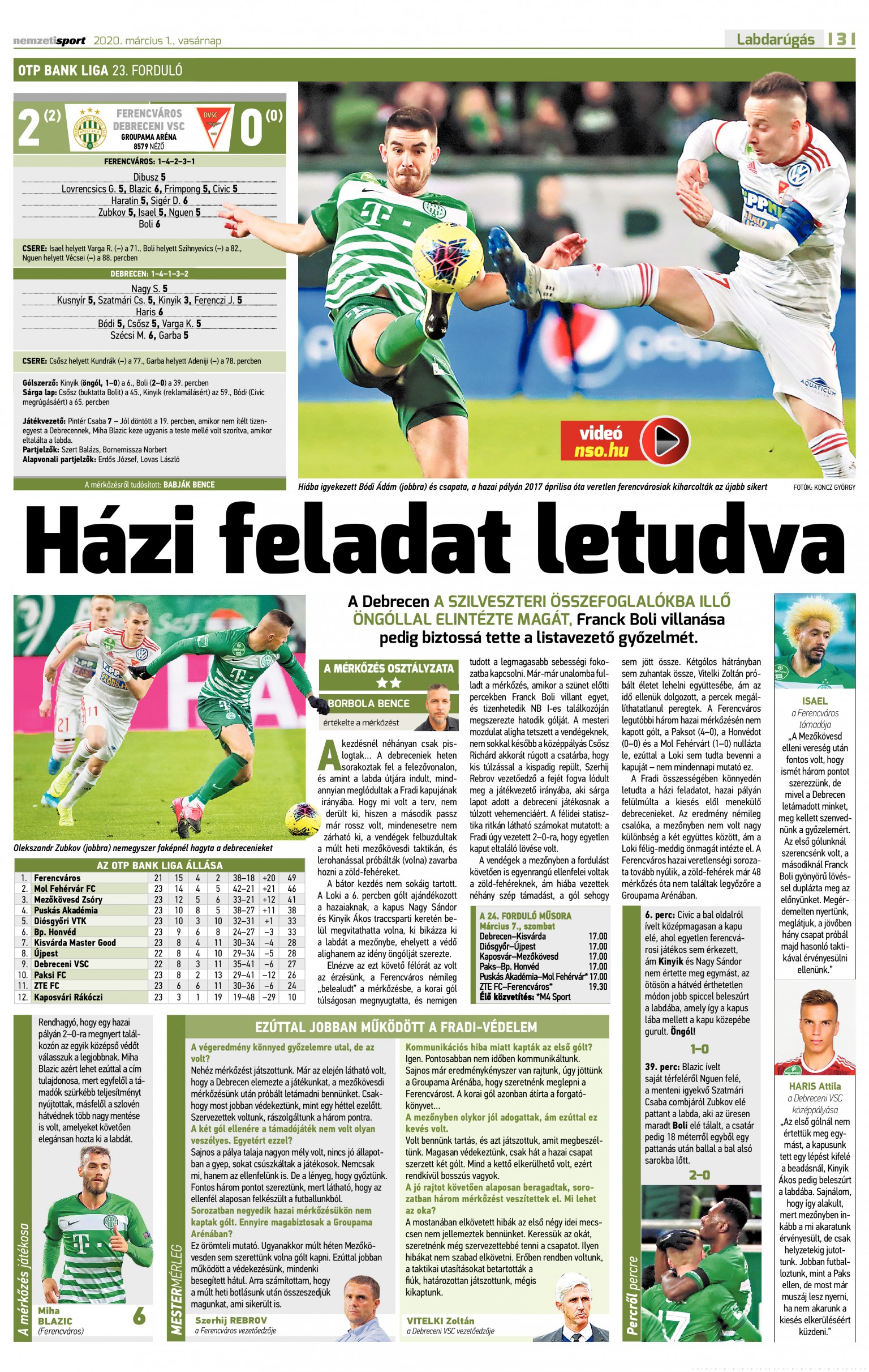 A zöld-fehérek az ősszel 6–1-re kiütötték a DVSC-t a Nagyerdei Stadionban, ebben a bajnokságban eddig ez a legnagyobb különbségű győzelem. A ferencvárosi öltözőben azonban nem emlegették sokat azt a találkozót. „Az ősszel minden sikerült, kijött a lépés, ám nincs két egyforma meccs. Akkor sem leszek elégedetlen, ha csupán egy nullára győzünk.”