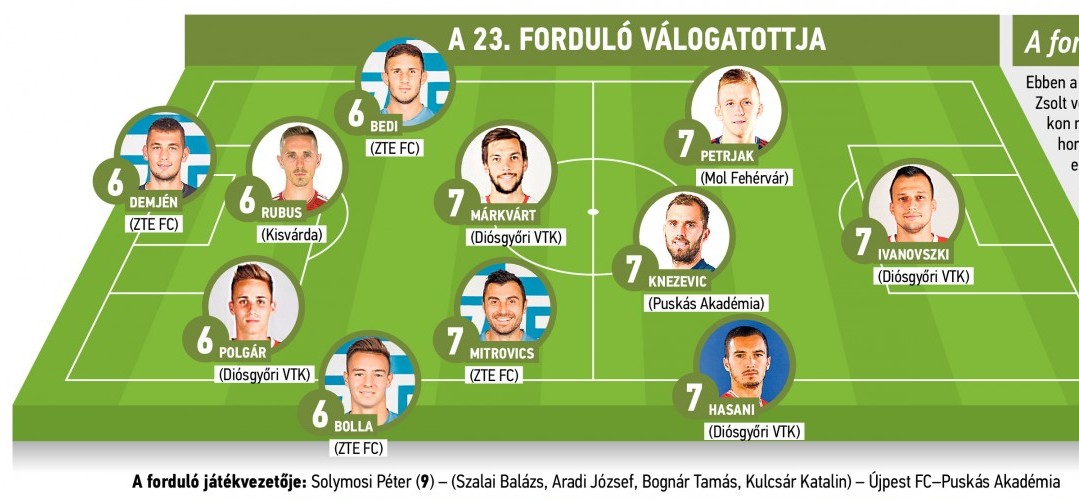 | Demjén (ZTE) 6 — Bolla (ZTE) 6, Polgár (DVTK) 6, Rubus (Kisvárda) 6, Bedi (ZTE) 6 — Mitrovic (ZTE) 7, Márkvárt (DVTK) 7 — Hasani (DVTK) 7, Knezevic (Puskás Akadémia) 7, Petrjak (MOL Fehérvár) 7 — Ivanovski (DVTK) 7 A forduló játékvezetője: Solymosi Péter (Újpest — Puskás Akadémia) 9 — Szalai Balázs, Aradi József, Bognár Tamás, Kulcsár Katalin |