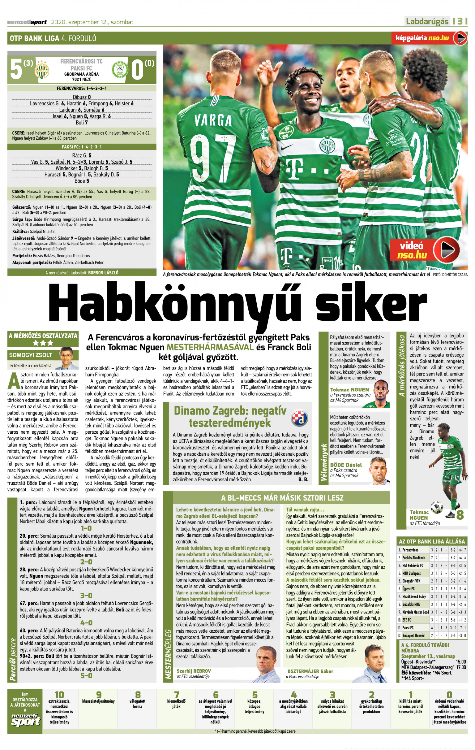 A válogatott szünet után a 4. fordulóval folytatódik a labdarúgó NB I, a kör nyitó mérkőzésén a Ferencváros 5–0-ra nyert odahaza a koronavírus által megtépázott Paks ellen.