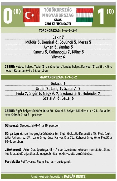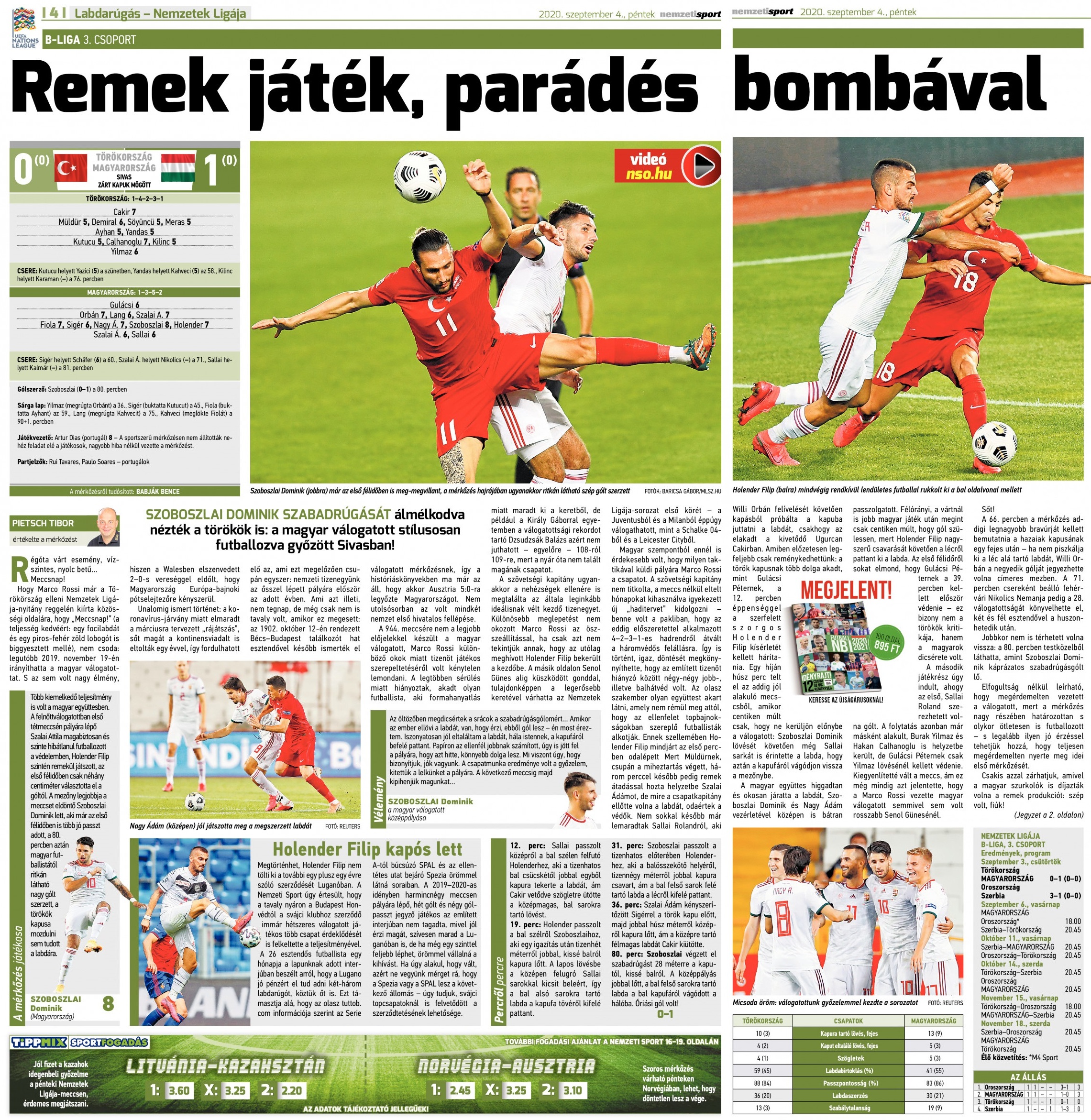 A labdarúgó Nemzetek Ligája B-divíziójának 1. fordulójában a magyar válogatott Szoboszlai Dominik pazar szabadrúgásgóljával 1–0-ra legyőzte Törökországot Sivasban.