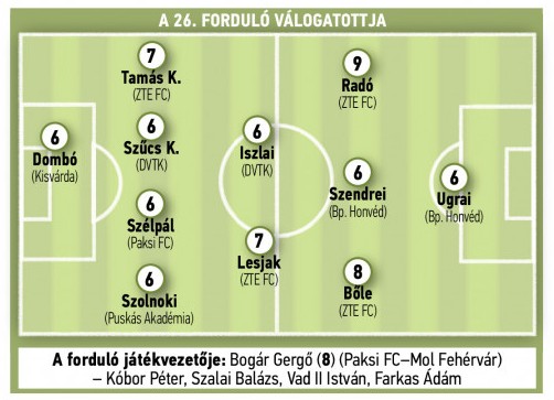 | Dombó (Kisvárda) 6 — Szolnoki (Puskás Akadémia) 6, Szélpál (Paks) 6, Szűcs K. (DVTK) 6, Tamás K. (ZTE) 7 — Lesjak (ZTE) 7, Iszlai (DVTK) 6 — Bőle (ZTE) 8, Szendrei (Bp. Honvéd) 6, Radó (ZTE) 9 — Ugrai (Bp. Honvéd) 6 A forduló játékvezetője: Bogár Gergő (Paks — MOL Fehérvár) 8 — Kóbor Péter, Szalai Balázs, Vad II István, Farkas Ádám |