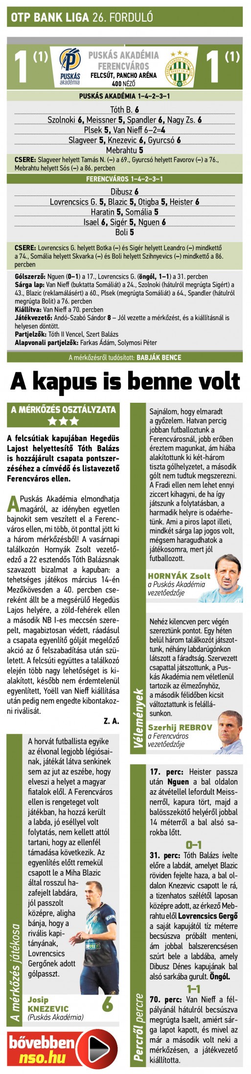 Rebrov a hajrára bevetette a Michal Skvarka, Mikalaj Szihnyevics duót és a legújabb szögletvariációt is, de ez sem segített: az egy pontnak a Puskás Akadémia örülhet jobban. 1–1