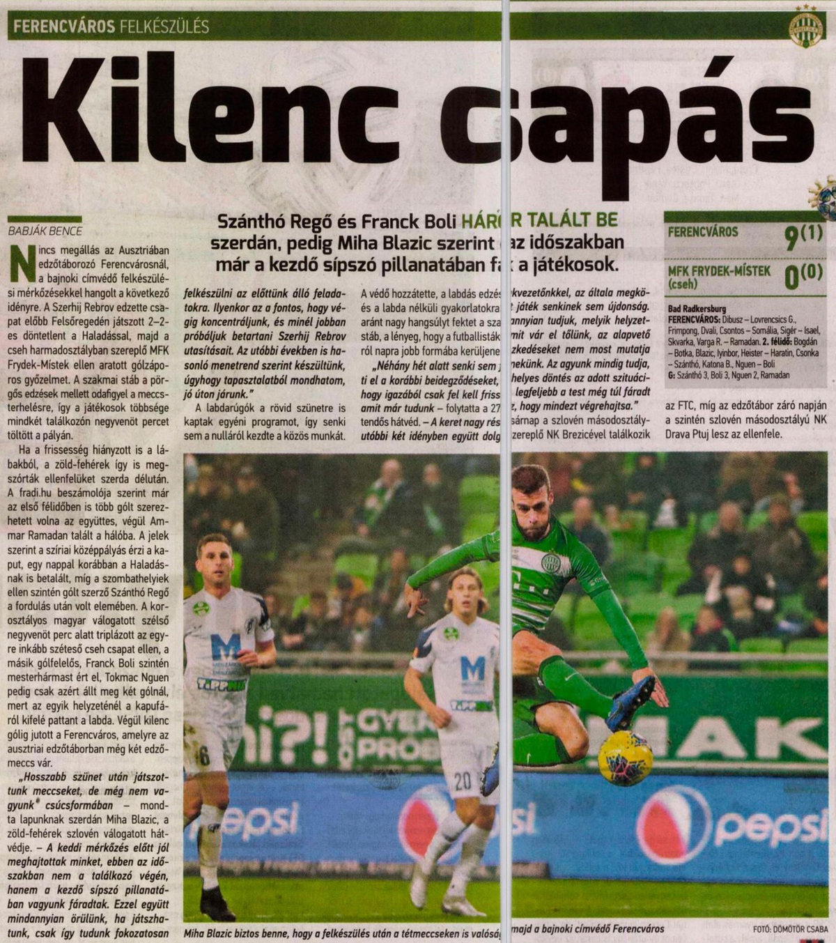 Ausztriában edzőtáborozik a Ferencváros, és a keddi, Haladás elleni edzőmeccs (2–2) után a cseh harmadosztályú Frydek-Místek volt az ellenfél. Az első félidőben szinte kizárólag a Fradi támadott, de különösebb eredmény nélkül, mert a távoli lövések vagy elkerülték a kaput, vagy a csehek kapusa védett.