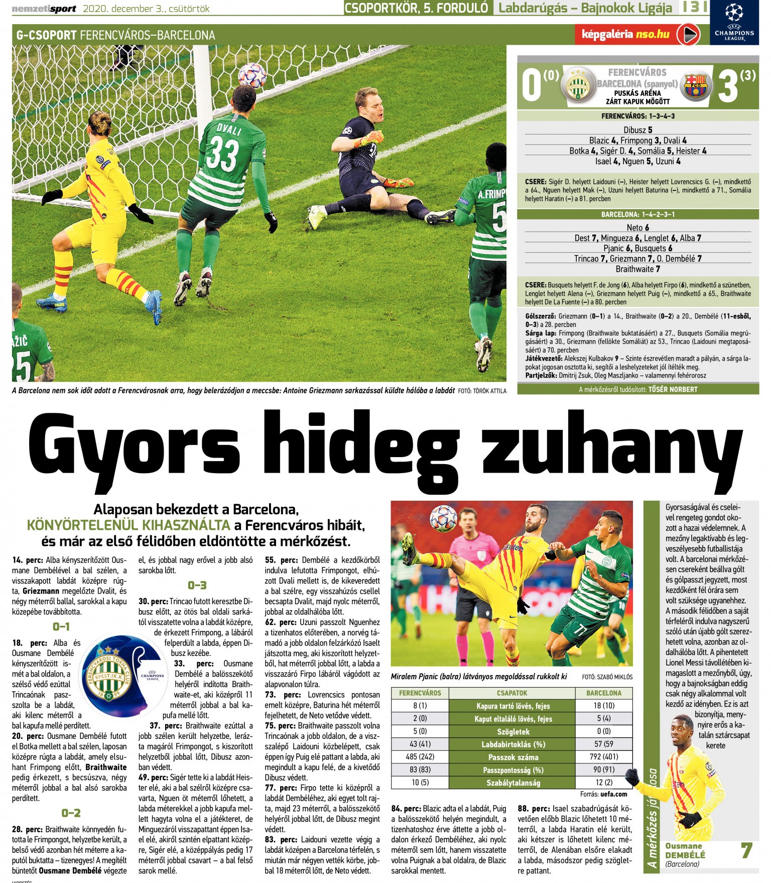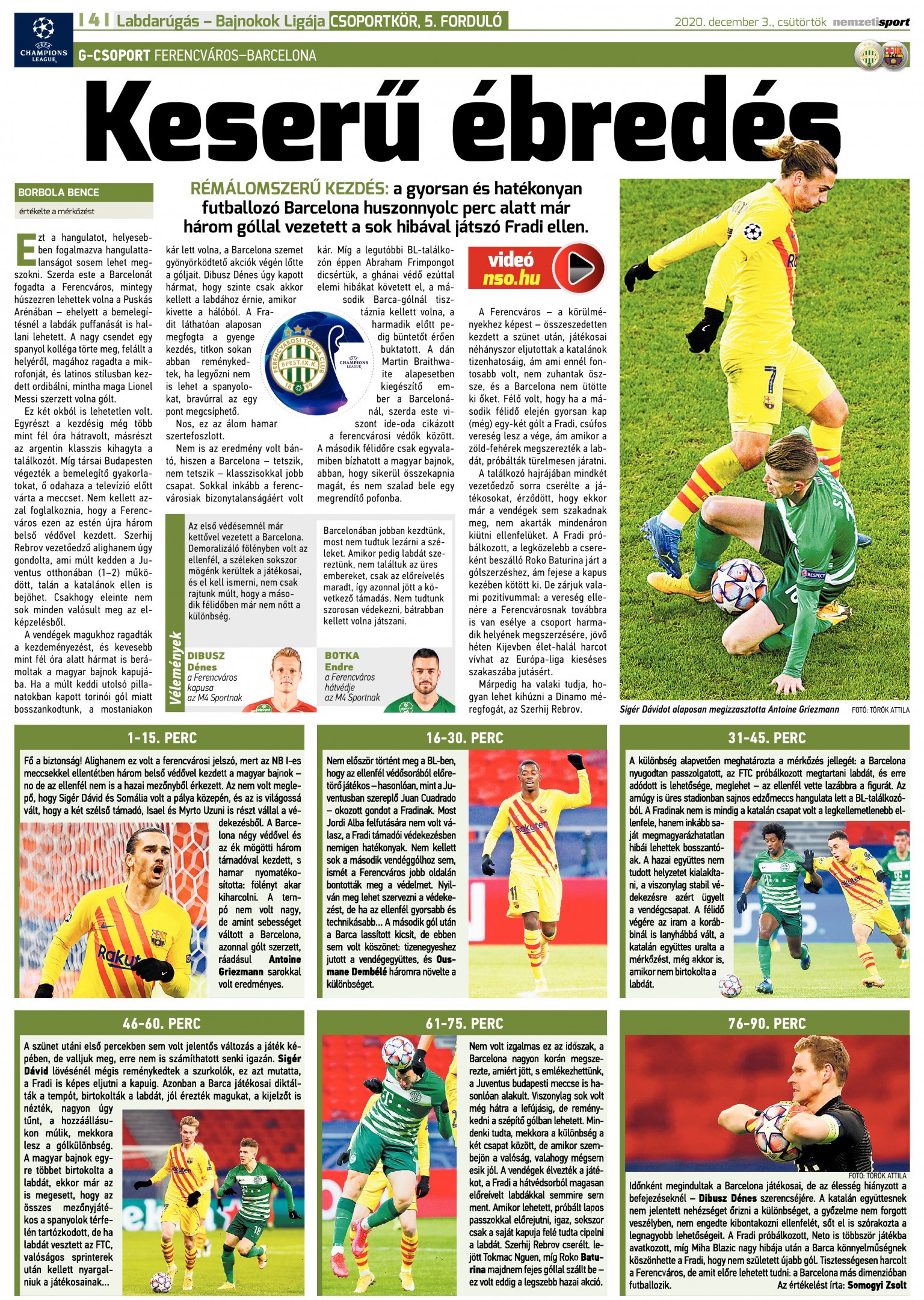 „Koeman B-terve Budapesten sem bukott meg. A Barca remekül teljesített, Antoine Griezmann és Ousmane Dembélé kiemelkedett, Martin Braithwaite pedig nagyszerűen játszott kilencesként. A gárdának egy félidő kellett, az első játékrészben kifogástalanul játszott, kellő intenzitással, a második félidőben már egy nyugodt, visszafogott csapatot láthattunk, amely nem kockáztatott, de így is dominált a Ferencváros ellen. A Barcelona minden szempontból kontrollálta a magyarokat: többek volt náluk a labda, jól járatták azt, néhányszor ugyan elveszítették, de olyankor gyorsan, agresszíven meg is próbálták visszaszerezni.”