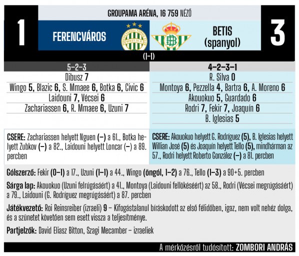A 76. percben Nabil Fekir szögletét követően a Betis megszerezte a győztes gólt (Henry Wingóról pattant a kapuba a labda…), talán a rutin, a koncentráció szólt a vendégek mellett. Nagyszerűen küzdött a Ferencváros, ám elmaradt a bravúr, sőt a legvégén Tello is betalált.
