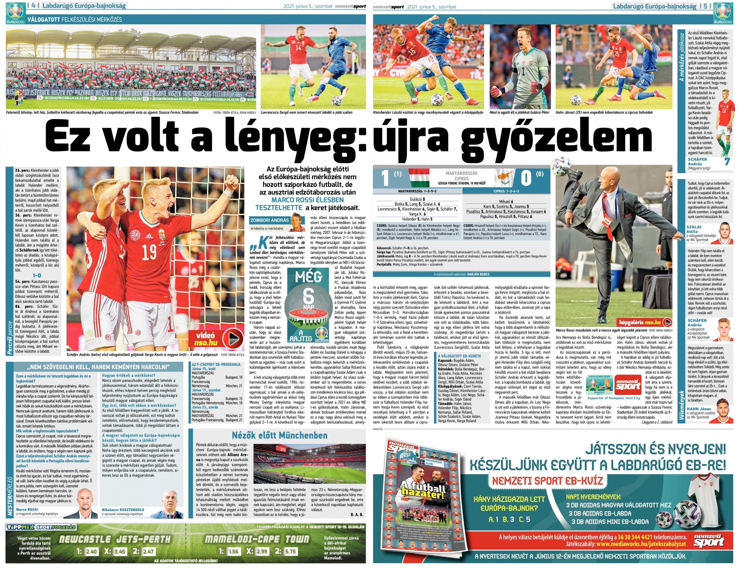 A részben hazai rendezésű labdarúgó Európa-bajnokságra készülő magyar válogatott Schäfer András góljával 1–0-ra legyőzte Ciprust a Szusza Ferenc Stadionban. Kedden újabb felkészülési mérkőzésen Írországgal találkozik Marco Rossi csapata, majd június 15-én jön a portugálok elleni Eb-rajt.