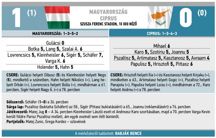 Véget ért a mérkőzés, a részben hazai rendezésű labdarúgó Európa-bajnokságra készülő magyar válogatott Schäfer András góljával 1–0-ra legyőzte Ciprust a Szusza Ferenc Stadionban.