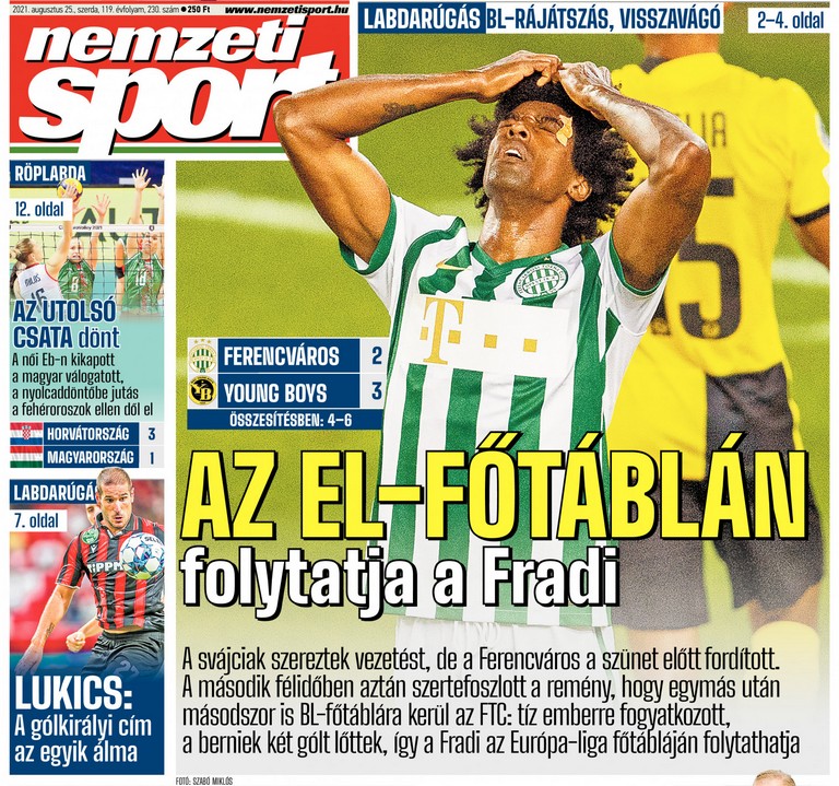 Berner Zeitung: „És hirtelen elcsendesedett” – utal a cím a Young Boys harmadik keddi góljára, amely eldöntötte a budapesti összecsapást. A cikk szerint a Groupama Arénában pokoli volt a hangulat. A berni csapat 2018-ban a Dinamo Zagreb, egy évvel később a Crvena zvezda vendége volt a BL-playoffban – ezekhez a találkozókhoz hasonlította a stadionban uralkodó légkört a szerző. „Fontos mérföldkő ez a Young Boys történetében. Akár harmincmillió frankot hozhat ez a siker.” A lap végül arról ábrándozik, milyen lenne, ha a Young Boys a Lionel Messivel felálló Paris Saint-Germainnel, a Robert Lewandowski vezette Bayern Münchennel vagy akár az Ajaxszal kerülne egy csoportba.