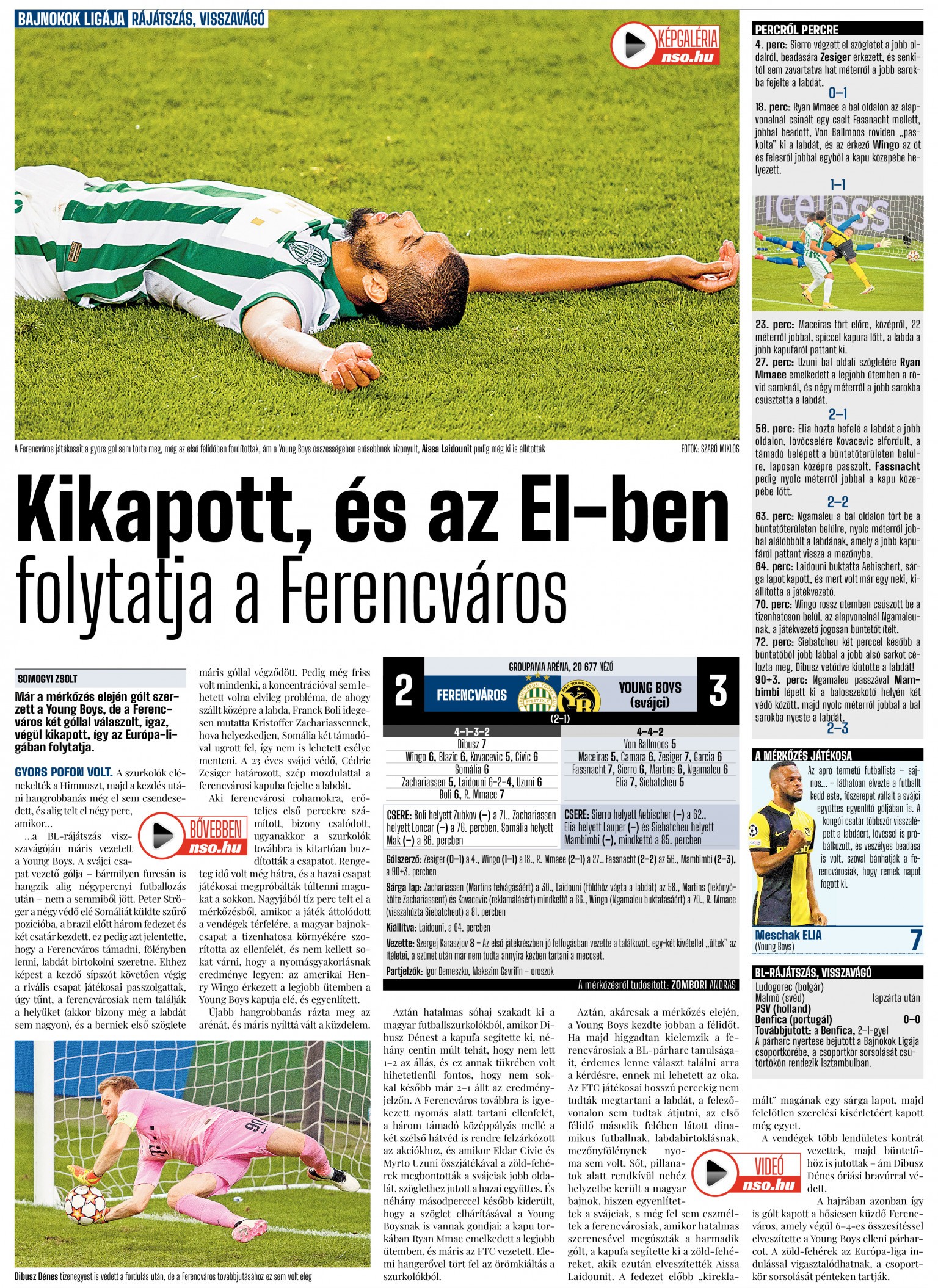 A vendégek több lendületes kontrát vezettek, majd büntetőhöz is jutottak – ám Dibusz Dénes óriási bravúrral védett. A hosszabbításban a Young Boys megszerezte a győztes gólt is a nem sokkal korábban beálló Felix Mambimbi révén (2–3). A Ferencváros kiesett a BL-ből – a Young Boys 6–4-es összesítéssel lépett tovább –, és az Európa-liga főtábláján folytathatja, az pedig a pénteki sorsoláson derül ki, hogy milyen ellenfelek társaságában.