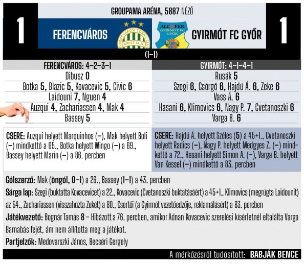 A Ferencváros egykapuzott a lefújás előtti percekben, de a gól sehogy sem akart összejönni, sőt a Gyirmót előtt is adódott lehetőség a góllövésre, a csapat értékes pontot szerzett a Groupama Arénában. 1–1