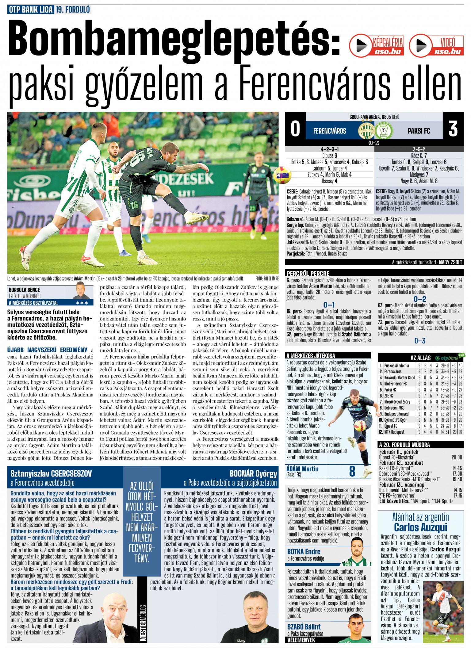 A Ferencváros hazai pályán meglepetésre 3–0-ra kikapott a Paksi FC-től a labdarúgó NB I 19. fordulójának záró mérkőzésén. Ebben az idényben először nem kapott gólt a Paks bajnoki mérkőzésen! Az FTC veresége azt is jelenti, hogy a Puskás Akadémia kétpontos előnnyel vezeti a tabellát.