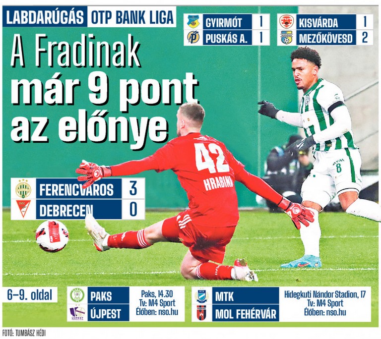 A Ferencváros a Kisvárda és a Puskás Akadémia szombati botlása után újabb lépést tett az újabb bajnoki cím felé, a nap végére kilenc pontra növelte az előnyét a második helyen álló felcsútiakkal szemben.