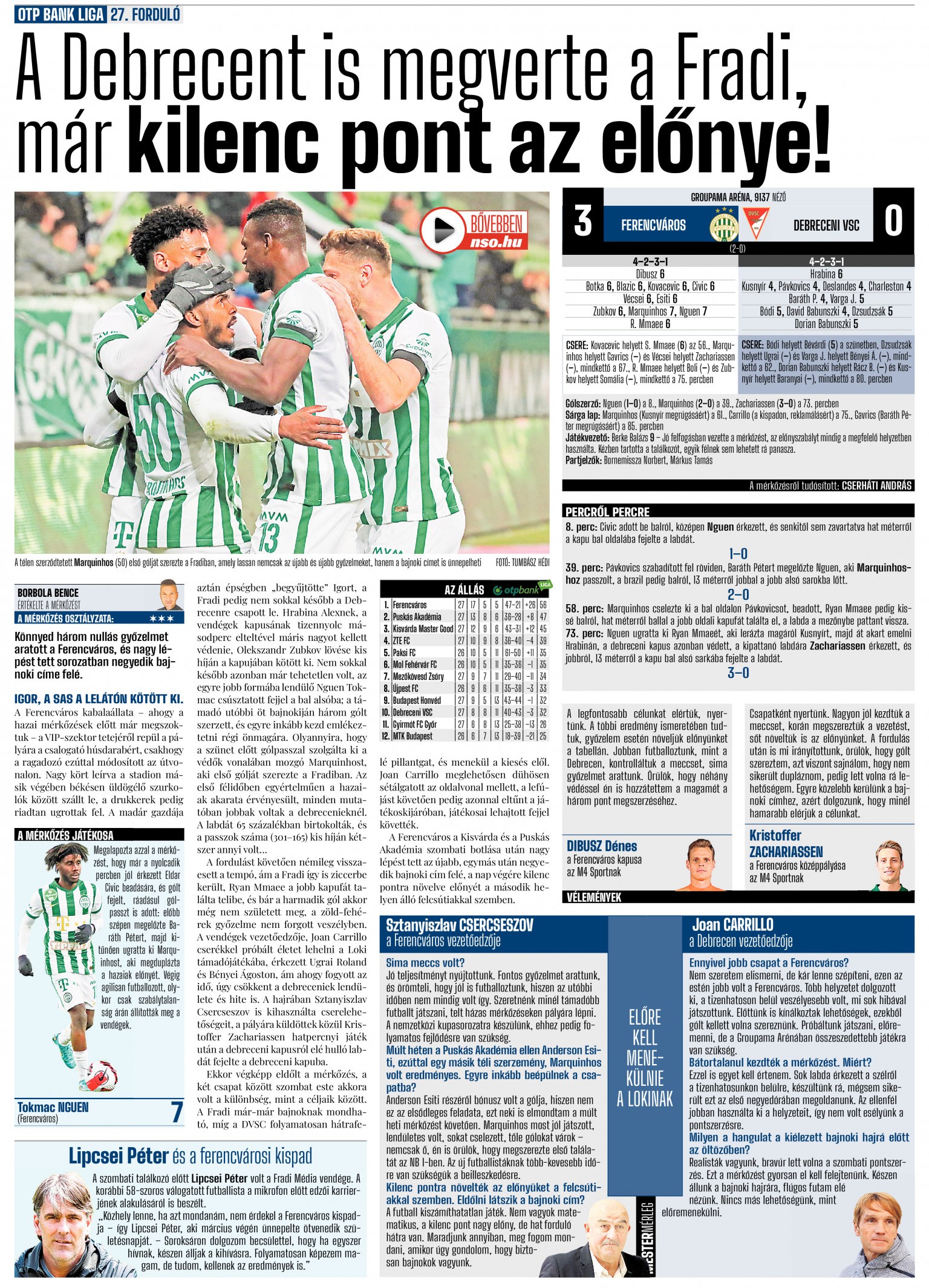 Ekkor végképp eldőlt a mérkőzés, ám a két csapat között szombat este a pályán egyébként is akkora volt a különbség, mint a célkitűzések között. A Fradi már-már bajnoknak mondható, míg a DVSC folyamatosan hátrafelé pillantgat, és menekül a kiesés elől. Joan Carrillo meglehetősen dühösen sétálgatott az oldalvonal mellett, a lefújást követően pedig azonnal eltűnt a játékoskijáróban, míg futballistái lehajtott fejjel indultak meg befelé.