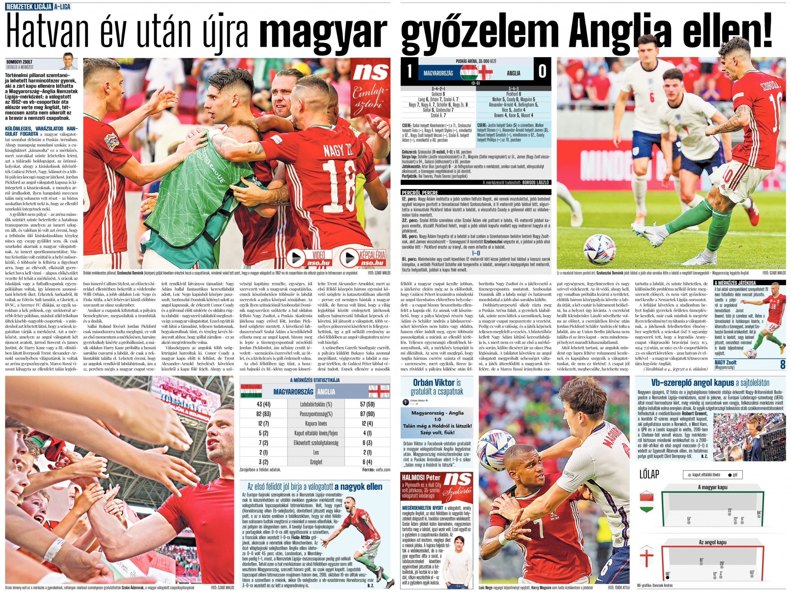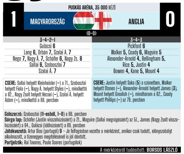 Attól lehetett tartani, hogy az angolok mindent egy lapra feltéve rohamozni kezdenek és kapujához szegezik a válogatottunkat, de nem ez történt! A csapat jól védekezett, megbecsülte, ha tehette megtartotta a labdát, és szinte hihetetlen, de különösebb probléma nélkül őrizte megszerzett előnyét és nem várt győzelemmel kezdte a Nemzetek Ligája-sorozatot.