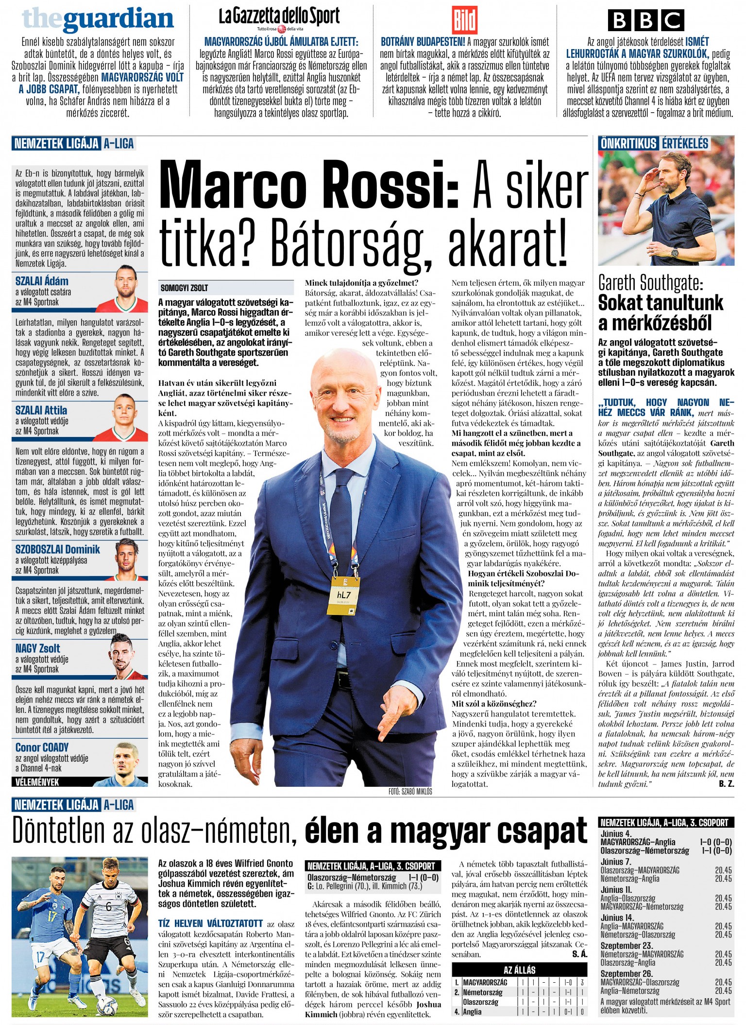 La Gazzetta dello Sport: „Magyarország újból ámulatba ejtett: legyőzte Angliát! Marco Rossi együttese az Európa-bajnokságon már Franciaország és Németország ellen is remekül helytállt, ezúttal pedig Anglia huszonkét mérkőzés óta tartó veretlenségi sorozatát (az Eb-döntőt tizenegyesekkel bukta el) törte meg” – hangsúlyozza a tekintélyes olasz sportlap.