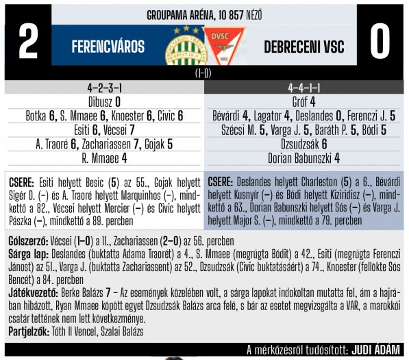 Ferencváros: Dibusz – Botka, S. Mmaee, Knoester, Civic (Pászka, 88.) – Esiti (Besic, 55.), Vécsei (Mercier, 88.) – Traoré (Marquinhos, 82.), Zachariassen, Gojak (Sigér, 82.) – R. Mmaee