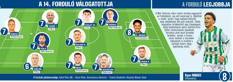 A labdarúgó NB I 14. körének záró mérkőzésén a Mol Fehérvár kétszer egyenlítve 2–2-t játszott hazai pályán a Ferencvárossal, így a fővárosi csapatok győzelem nélkül fejezték be a fordulót.