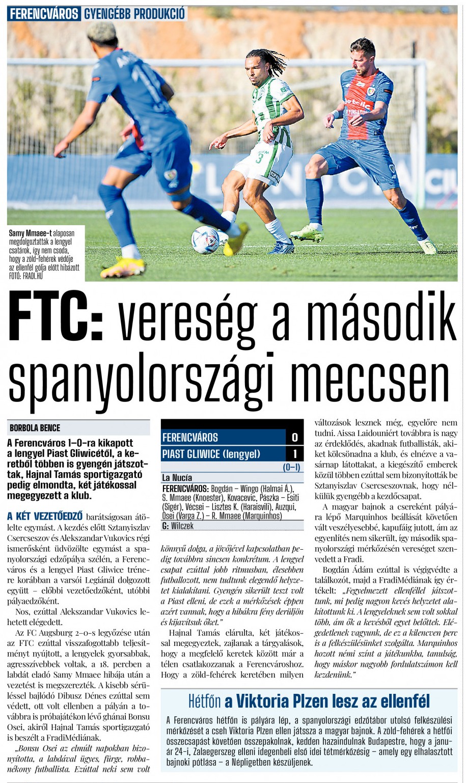 A Ferencváros folytatta edzőmérkőzései sorát Spanyolországban, ahol az Augsburg elleni győzelem után gyengébb játékkal egygólos vereséget szenvedett a lengyel bajnokság 16. helyén álló Piast Gliwicétől.