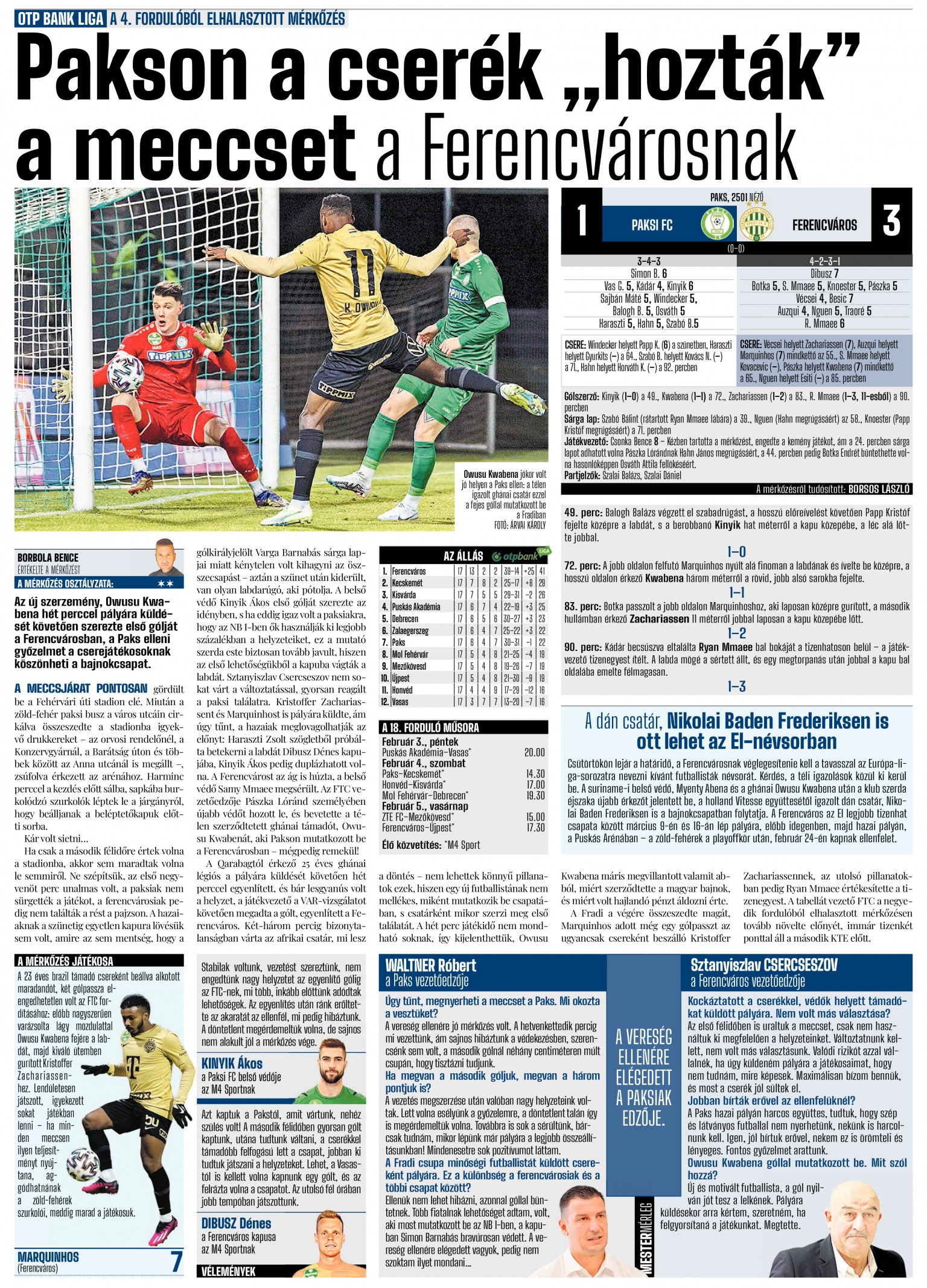 Csercseszov azonban tovább kockáztatott, Pászka Lóránd személyében újabb védőt hozott le, és bevetette a télen szerződtetett ghánai támadót, Owusu Kwabenát, aki Pakson debütált a Ferencvárosban.
