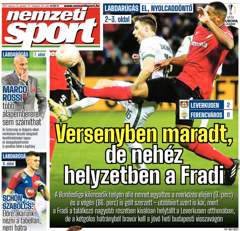Úgy tűnt, a zöld-fehérek masszív futballjukkal kihúzhatják újabb kapott gól nélkül a hátralévő időt, ám a hajrában a Bayer Leverkusen szabadrúgást követően betalált, és ezt igazán bánhatta a Ferencváros, hiszen pluszmotivációt adott volna egygólos hátránnyal nekifeszülni a visszavágónak. Március 16-án, csütörtökön 21 órától a Puskás Arénában remélhetőleg negyven-ötven ezer magyar futballfanatikus hajtja majd előre a Fradit – a csapatnak meg kell próbálnia a lehetetlent…