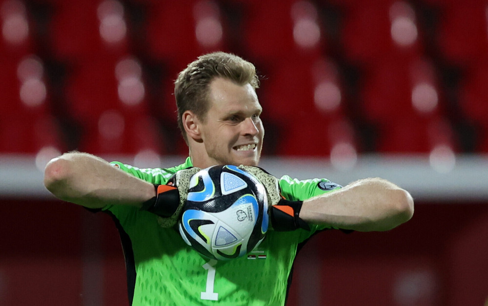 Pavlovics indítása elé odaáll Orbán, jöhet Dibusz, fogja is a labdát.