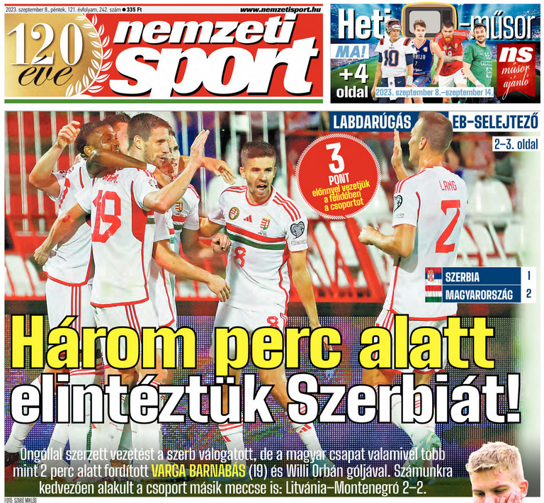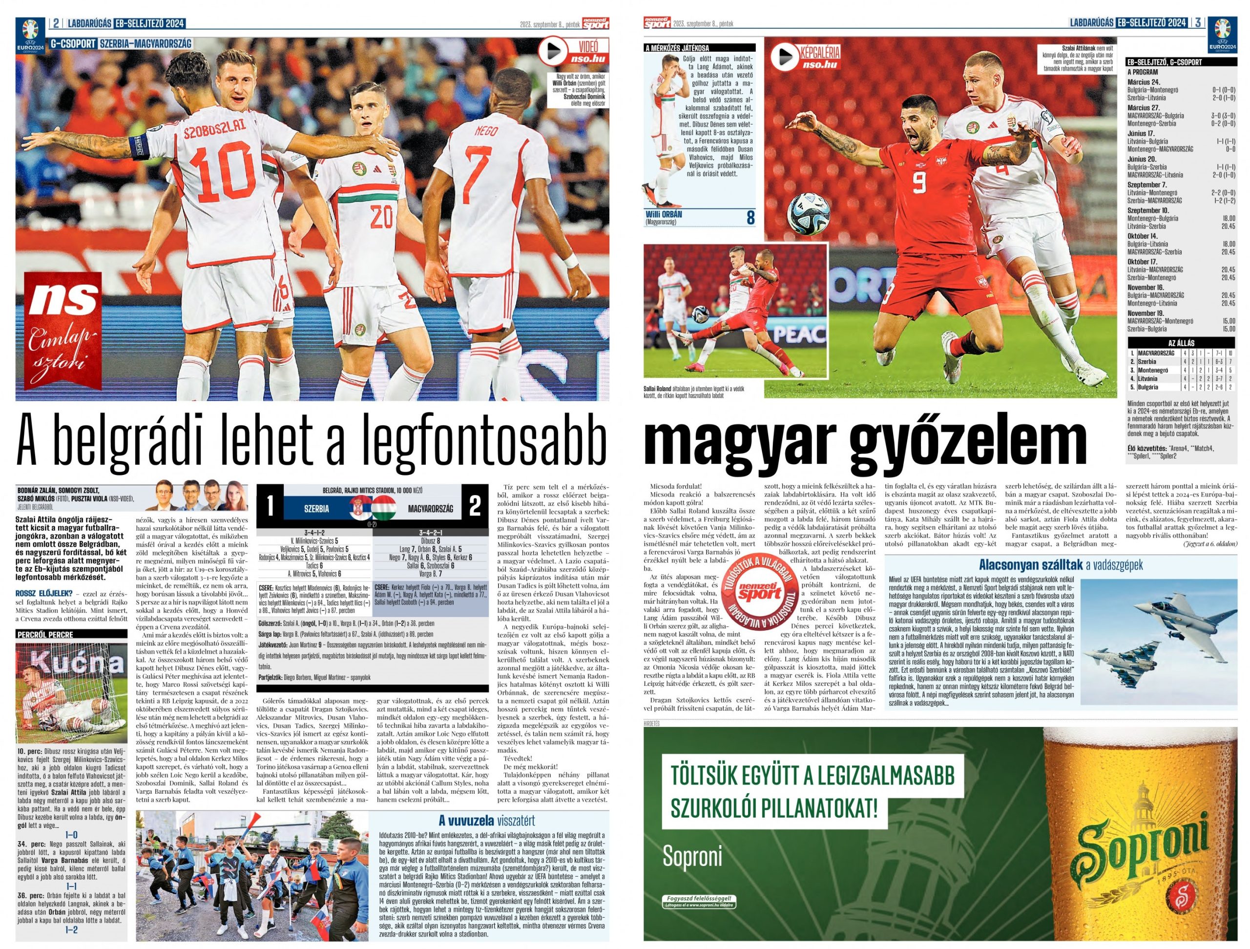 A magyar válogatott 2–1-re nyert Szerbiában a labdarúgó Európa-bajnoki-selejtezősorozat 5. fordulójában, ezzel karnyújtásnyira van attól, hogy kijusson a 2024-es kontinenstornára.