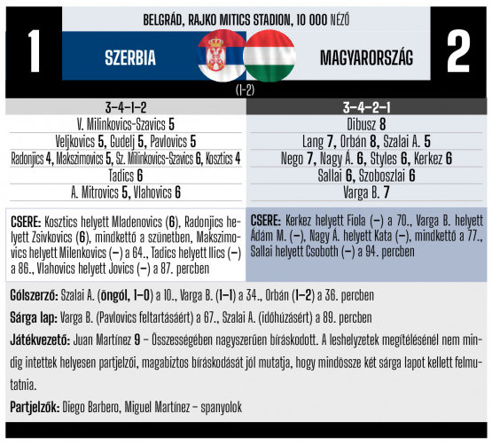 Tíz perc sem telt el a mérkőzésből, amikor a rossz előérzet beigazolódni látszott, az első kisebb hibára könyörtelenül lecsaptak a szerbek: Dibusz Dénes pontatlanul ívelt Varga Barnabás felé, és bár a válogatott megpróbált visszatámadni, Szergej Milinkovics-Szavics gyilkosan pontos passzal hozta lehetetlen helyzetbe – a magyar védelmet. A Lazio csapatából Szaúd-Arábiába szerződő középpályás káprázatos indítása után már Tadics is gólt lőhetett volna, ám ő az üresen érkező Dusan Vlahovicsot hozta helyzetbe, aki nem találta el jól a labdát, de az Szalai Attila lábáról a hálóba került. Öngól.