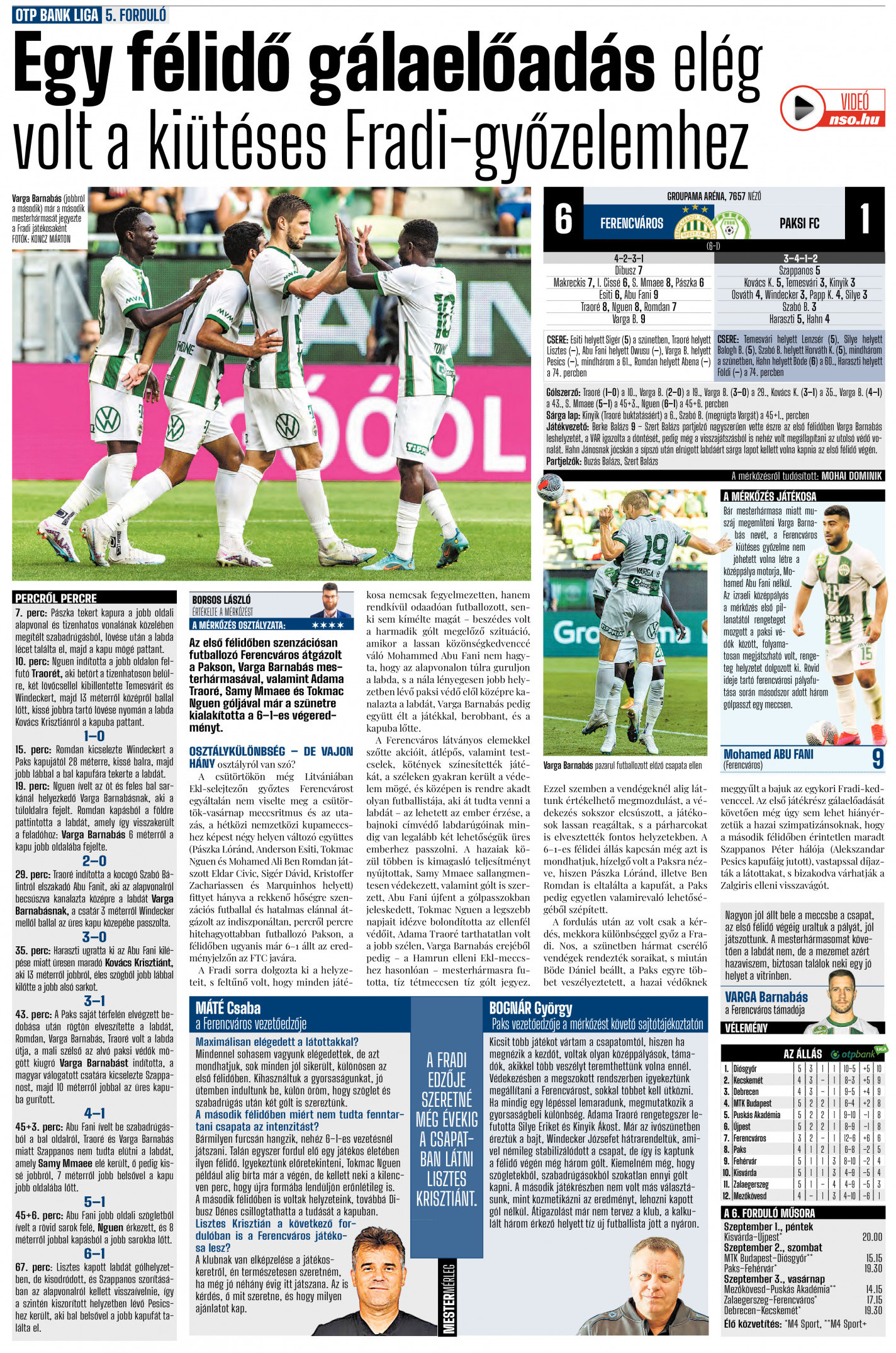 „A labdát nem, de a mezemet azért hazaviszem, biztosan találok neki egy jó helyet a vitrinben – mondta kérdésünkre válaszolva harmadik NB I-es triplázását követően Varga Barnabás. – Különleges volt számomra ez a meccs, mert nagyon szerettem Pakson futballozni, korábbi csapattársaimmal tartom a kapcsolatot – de miután elhangzott a kezdő sípszó, már nem foglalkoztam vele, kihez milyen viszony fűz. Utólag nyilván kicsit sajnálom, hogy a góljaimmal elszomorítottam a paksi szurkolókat, illetve a játékosokat, de a pályán nem foglalkoztam ezzel, csak arra összpontosítottam, hogy minél több gólt szerezzek, és segítsem a csapatomat. Nagyon jól állt bele a csapat a mérkőzésbe, az első félidőben végig uraltuk a pályát, ami meg is látszott az eredményen, egy játékrész leforgása alatt eldöntöttük a meccset. Nem tartom számon, hány meccsen mennyi gólt szereztem, a mérkőzés után szembesültem a statisztikával. A tíz gól, valamint a négy gólpassz ellenére nem mondanám, hogy álomszerűen kezdtem a Fradiban, mert még ott van a fejekben az első két, Klaksvík elleni BL-mérkőzés emléke, de azért örülök, hogy most már jönnek a gólok. Korai még erről beszélni, de csatárként nyilvánvalóan ebben az évadban is szeretnék benevezni a gólkirályi címre. Nem tudom, tartogat-e bármilyen meglepetést a keddi válogatott kerethirdetés, bízom benne, hogy ismét kapok meghívót. A válogatott meccsekig azonban lesz még két mérkőzésünk, köztük csütörtökön a Zalgiris elleni Európa-konferencialiga-rájátszás visszavágója. Viszonylag nyugodtan, de semmiképpen sem hátradőlve várhatjuk a párharc második felvonását, szeretnénk saját közönségünk előtt is nyerni.”