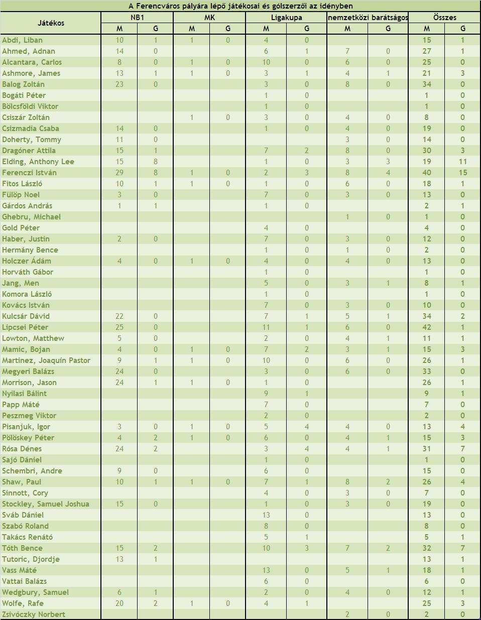 Ferencváros: Megyeri B. – Csizmadia, Balog Z., Tutoric, Stockley – Wolfe R., Doherty, Morrison, Tóth B. – Ferenczi I., Elding