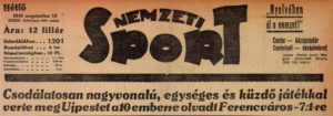 „A bajnokcsapat teljesítménye éppen olyan kimagasló haditett volt, mint az Austria vagy a Gradjanski elleni megsemmisítő győzelem. Sőt: a Ferencváros nagy diadalának az értékét még külön emeli az a körülmény, hogy a döntő fölényt tíz emberrel vívták ki a zöld-fehérek. Valószínű, hogy a megfogyatkozott ferencvárosi gárdában a túlerő elleni harc fölébresztette a kétségtelenül meglévő ferencvárosi virtust is, amely kihozta a csapat minden értékét. A zsúfolt ház előtt aratott nagy arányú győzelemről még sokáig fognak beszélni s még sokan fogják érthetetlen csodának minősíteni a tíz ferencvárosi fiú mindent elsöprő győzelmét tizenegy újpesti ellen. Csodák azonban nem történnek, igyekezzünk tehát a bíráló tárgyilagossággal kinyomozni a nagy győzelem okait. A játék első negyedórájában még nem lehetett következtetni a végeredményre. Hatalmas iramot diktált mid a két fél, mintha érezték volna a résztvevők, hogy az első gól erkölcsi hatása nagyon fontos lesz. Arra azért kevesen számítottak, hogy a 36. percben, 2:0-s Ferencváros vezetésnél a legénység 10 főre csökken. Ez nem veti vissza a zöld-fehéreket és a szünet előtt Finta növeli az előnyt. A II. félidő, amelynek az első percében már 4:0 az eredmény s amelyben ‘apa játszik a fiával’ – akkora a zöldek fölénye. A vége kiütéses 7:1 – tíz emberrel. Csodák emlegetése helyett állapítsuk meg, hogy a Ferencvárosban több a klasszisjátékos és több a jó formában lévő játékos mint az Újpestben. A Ferencváros ezenkívül lényegesen összeszokottabb csapat. Végül csak annyit, hogy az egy ember előnyt az Újpest azért nem tudta kihasználni, mert a Ferencváros még tíz emberrel is jobban osztotta el a pályát és sokkal harcosabban játszott.” (1941 – Újpest)