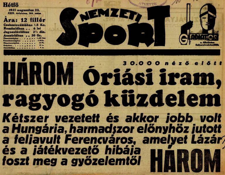 „Harmincötezer torok hatszor kiabálja vasárnap kipirultan, nekihevülve: Góóóól! A futballderby harmincötezer főnyi közönsége tapsolt, dörgött, örült s háborgott. Megkezdődött a labda döntetésének csodálatos muzsikája, a futballszimfónia s a futballszezon nyitányában mindjárt az első alkalommal összekerült a két régi rivális, a Ferencváros és a Hungária. Fellángolt a tribünön és a páláyn a régi zöld-fehér és kék-fehér versengés s végül mindenki örült a 3:3 arányú döntetlennek. Lovagi torna volt ez huszonkét játékos között az elsőségért, a bajnoki pontokért, a győzelemért, a közönség szeretetéért. Nincs győztes, nincs vesztes, a szezonnyitó mérkőzésen egyedül a sport győzött.” (1937 – Hungária)