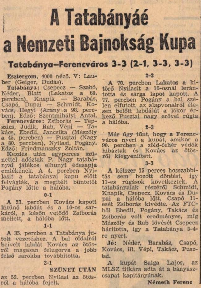 1979. Tatabánya – Ferencváros 3-3, Nemzeti Bajnokságok kupája