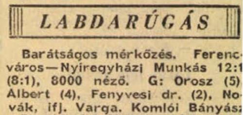 1961. Nyíregyházi MTE – Ferencváros 1:12, Edzőmérkőzés