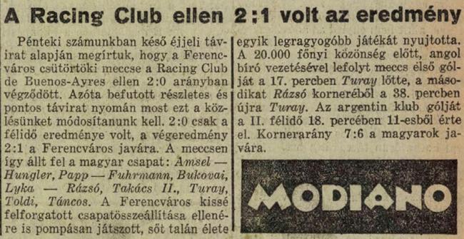 1929. Racing Buenos Aires – Ferencváros 1-2, nemzetközi barátságos