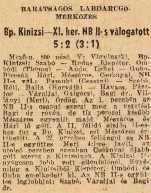 1952. XI. kerület válogatott – Bp. Kinizsi 2:5, Éremmérkőzés