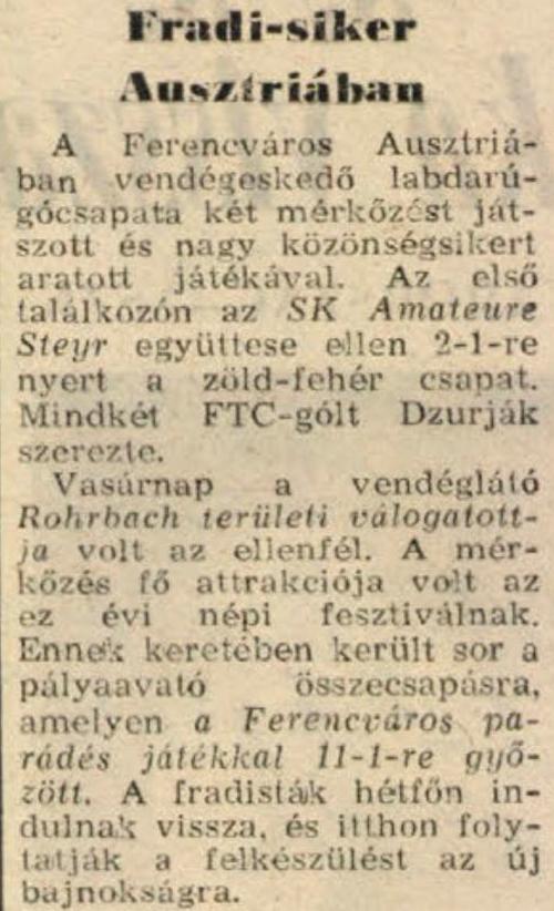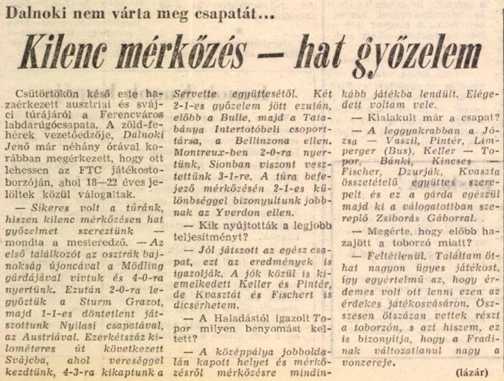 „A harci zaj csak egy hónapja csitult el, még javában áll az esőbehajló nyár, a lelátók népe azonban ismét sereglik. Terepszemlére indul, köszönti és fürkészi szép reményeinek régi és új hordozóit….A Ferencvárosban Kökény jobbszélső magabiztosan tette le a névjegyét az Üllői úton, ügyes megoldásait sokszor kísérte hálás taps. Helye van a csapatban. A jobbösszekötő Kunos nagy lövéseket eresztett meg, de még kissé idegenül mozgott. Feltűnt Fenyvesi, Orosz, Kocsis és Mátrai nagy játékkedve, Novák néhány gyilkos szabadrúgása, Landi bizonytalansága. És ami természetes: a sérült Rákosi és Dalnoki hiánya. Albert és Novák góljaival 2:0-ra maradt alul a BVSC.” (1961 – BVSC)