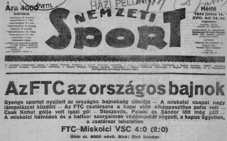 „A jubiláris ünnepségek egyik kimagasló eseményének szánták, ehelyett azonban a nyári futballtilalom élő propagandaeszközévé lett az 1925-26. évi országos bajnoki döntő. A bajnoki döntőnek a legjobbak élet-halálharcának kellene lenni a nemes és büszke bajnoki címért, amelyért 23 ifjú megfeszített izmokkal, tudásuk legjavát nyújtva küzd 20 percen keresztül. Gondolatban a magyar bajnoki döntőt is ilyennek képzeltük, a valóságban azonban egészen mást kaptunk. Nem volt a mérkőzésnek egyetlen momentuma, egyetlen fázisa, amikor legalább ízelítőt nyerhettünk volna az igazi küzdelemből. z országos bajnoki döntőbe ugyanis nem a ténylegesen legjobbak kerültek be. Az FTC még mai gyengébb formájában is méltóan képviseltette volna ugyan a fővárost, ellenben az MVSC-t semmi esetre sem tekinthetjük a vidék legjobbjának, hiszen legalább négy-öt jobb csapat van a vidéken.” (1926 – MVSC)