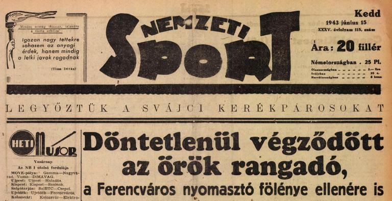 „Rangadó, derby vagy…amit akartok. Érdemes elgondolkodni rajta, hogy míg régebben a fenti elnevezést csak a bajnoki döntő mérkőzésekre alkalmazták, most az 5-ik és a 8-ik helyezettek találkozását is ennek minősítik. Ez a meghatározás persze csak akkor érvényes, ha az ezek a csapatok történetesen a Ferencváros meg az Újpest. ennek a két csapatnak a mérkőzésén most is huszonötezres tömegben sereglett ki a szurkolók és a sportérdeklődök népes tábora, ami ékes bizonyítéka a labdarúgósportunkban is érvényes hagyományok tiszteletének. A csapatok jó sporttal hálálták meg a közönség hatalmas érdeklődését és végig nyílt küzdelem után döntetlenben egyeztek ki egymással. Hiába volt a ferencvárosi fölény, ha nincs átütő erő a csatársorban. A Ferencváros öt öreg támadó harcost küldött a tűzbe a vasárnapi rangadón. Ez a csatársor pompás játékot mutatott be, a labda úgy szállt egyik lábról a másikra mintha zsinóron húzták volna, de…az újpesi kapu előtt csődött mondott a tudományuk. Szemfényvesztően gurigáztak, bravúrakciókat dolgoztak ki, de amikor a góllövésre került volna a sor, a kemény újpesti védőkkel szemben mindig alulmaradtak.” (1943 – Újpest)