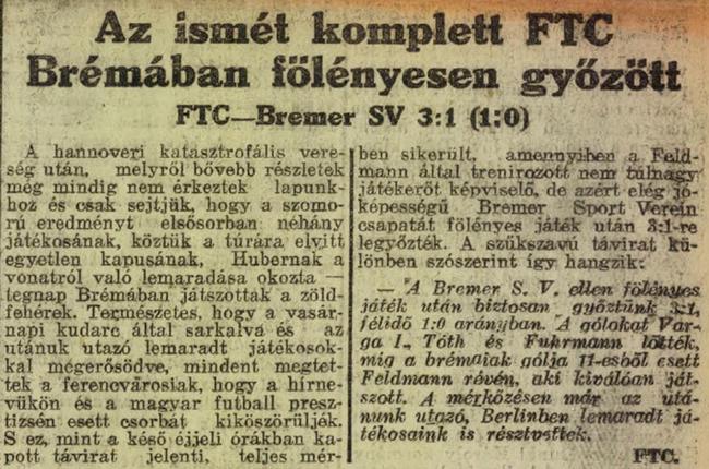 1926. Bremen SV – FTC 1-3, nemzetközi barátságos