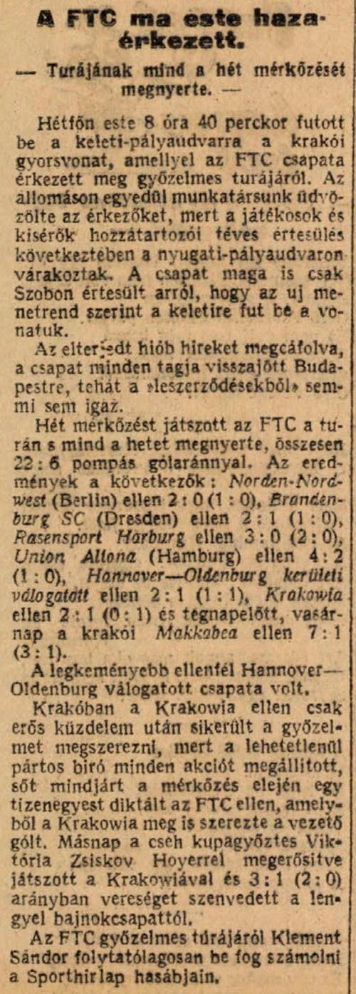 1924. Makkabea Krakkó – FTC 1-7, nemzetközi barátságos