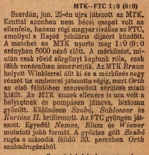 „FTC kezd és rövid, változatos játék után a TTC kapuja elé telepszik. Gyönyörű csatárjátékkal feledteti el hálás publikumával mindazt a keserűséget, amit a szezonban okozott neki. A balszárny remekel, de Schwarz is okosan játszik s a lövések is gyakoriak. Obitz, Pataki, Tóth sorban küldik hatalmas lövéseiket, de az élesszemű Füleki pompásan véd. Közben a TTC le-lefut, de az FTC-védelem ujólag előreveti a csatársort, mely ötletes támadásokkal szorongatja a TTC kapuját. Füleki Tóth lövését még elhárítja, de Pataki lapos lövése a háló jobb sarkában akad meg. Helycsere után állandó FTC fölény. Szép támadások, sok lövés jellemzik ezt az időszakot. A TTC egyre durvább, Procenkót és Győrit kiállítja a bíró. Az FTC-ből a csatársor brillírozott, jól játszott Blum és Wilheim, valamint Hungler II.” (1922 – TTC)