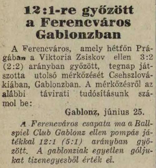 1930. BSC Gablonz – Ferencváros 1-12, nemzetközi barátságos