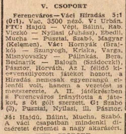 „Az egész nap zuhogó eső a mérkőzés előtt egy órával elállt ugyan, de addigra alaposan felázott a talaj. A pályán a pirosinges Gamma jelenik meg elsőnek, a zöld-fehér inges, zöldnadrágos Ferencvárost Nagy II. vezeti. A mérkőzés eredménye hűen fejezi ki azt a különbséget, amit a két csatársor között volt. Sőt, ha a két balszárny közötti különbségre gondolunk, akkor azt csak a kétszámjegyű gólaránnyal lehetne kifejezni. Viszont a Gamma jobbszárnya jobb volt a Ferencvárosi jobbszárnynál. A diadal főrészese a Kiszely-Gyetvai kettős. Gyetvai változatlanul tartja válogatott formáját, Kiszelyben kitűnő kiszolgálóra talált. A Ferencvárosi tank hosszú szünet után játszott újra s játékával megmutatta, hogy kár volt elvesztegetni a tartaléksorban töltött hónapokat. Lövőereje olyan érték, amely a Ferencvárosnak bizonyára nagy szolgálatokat tesz majd még a bajnoki hajrában. A pöttömnyi Nagy II. teljesen feledtetni tudta a kitűnő Hámorit is.” (1940 – Gamma)