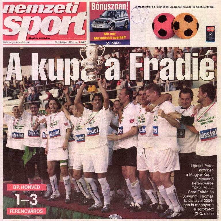 „A május 5.-i magyar kupadöntőre a Puskás Ferenc stadionban került sor, mindösszesen négyezer néző előtt. Miért voltunk csak ennyien? Nehéz rá válaszolni, de talán összefügg azzal, hogy bár voltak sikerek, de 2004 tavaszán már gyülekeztek a sötét felhők. Ehhez jött még, hogy Pintér Attilának sem sikerült igazán elfogadtatnia magát a közönséggel, és sajnos a játékosokkal sem. Ettől függetlenül egyértelmű esélyesei voltunk a kupadöntőnek, hiszen a magyar kupadöntő idején a Bp. Honvéd még az NB1/B listavezetője volt. Ráadásul hosszú idő után újra a legjobbnak mondott összeállításban küldhette pályára Pintér Attila a Ferencváros csapatát. Az egész kupadöntőn a Ferencváros címvédőhöz méltóan, kiválóan futballozott, és esélyt sem hagyott a Honvédnak. A zöld-fehérek – akik huszadszor nyerték el a trófeát – így három bajnoki vereség után megnyugodhatnak: Magyar Kupa-győztesként mindenképpen indulnak az UEFA-kupában…Minden kétséget kizárólag Tököli Attila volt a mezőny legjobbja. A középcsatár nagy kedvvel, Fradi-szívvel futballozott. Tökéletes összhangban a csapatkapitány Lipcsei Péterrel. Amikor Lipcseinél volt a labda, Tököli a leshatáron, kiugrásra készen várta az átadásokat. De nemcsak jól cselezett és megtartotta a labdát, a védekezésből is kivette a részét… Pintér Attila: — Gratulálok a játékosoknak, akik mindent elkövettek azért, hogy a Fradi megőrizze a Magyar Kupát. Fegyelmezetten futballoztunk, jó volt látni a közönségszórakoztató játékot.” (2004 – Bp. Honvéd)