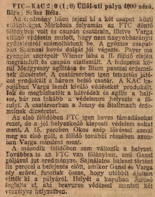 „A Ferencváros még nagyon hézagos, Somogyot nem kell félteni a nagyarányú vereség ellenére sem. Ha a kis Takács hallgat az orvosokra és nem jön vissza, akkor bizonyosan egészen más eredmény születik. Tíz emberrel a Ferencváros nagyon nehezen nyerte volna meg a mérkőzést, ami bizony nem a legjobb fényt vet a zöld-fehérekre, hiszen a rosszhelyezésű Somogy volt az ellenfél. Nagy hézagokat találni még a zöld-fehérek csapatában. Dicséretet a tegnapi játék után csak Takács II. érdemel, aki sérülten, kóválygó fejjel is visszajött a pályára és két góllal járult hozzá a győzelemhez. | Takács II.: — Zúg a fejem, folyton két labdát láttam… – Valaki meg is jegyzi: – Ritka az ilyen játékos.” (1930 – Somogy)