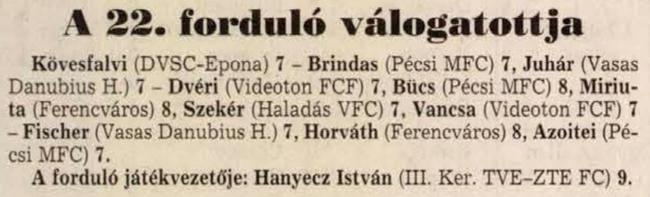 „A ferencvárosiak a kilencvenből hatvan percet remekül teljesítettek, gólerős játékkal szórakoztatták közönségüket…Óriási lendülettel kezdtek a ferencvárosiak, teljesen beszorították a vendég csepelieket. A szélekről belőtt labdákkal veszélyeztettek a zöld-fehérek…A csepeliek szépítő góljukat követően többször is zavart keltettek az FTC védelmében. Szekeres, majd Baranyi ajtó-ablak helyzetben hibázott. Mintegy tíz percig tartott ez a kisebb figyelmetlenség a ferencvárosiaknál, a befejező öt percre aztán ismét a már az egész mérkőzésre jellemző támadókedv nyilvánult meg a hazaiak részéről. Horváth ebben az időszakban két találattal is növelhette volna góljainak számát.” (1997 – Csepel)